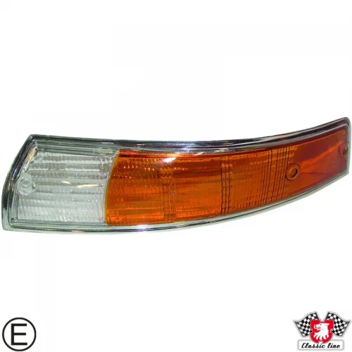 Lens for indicator with chrome rim, front, EU version, orange/clear, left, with E-mark
